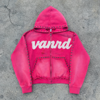 Hot pink custom zip up hoodie with chenille logo, stud trim and raw hem for private label streetwear.