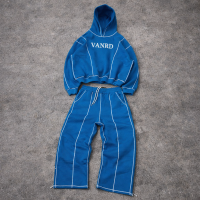 Custom tracksuit set in brushed fleece with cropped hoodie, contrast seam lines and wide-leg pants for private label.