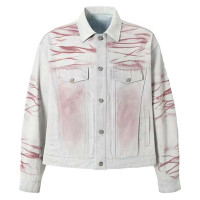 Light wash custom printed denim jacket with pink graphic lines, cropped trucker fit, button front and OEM label options.