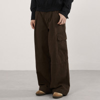 Custom cargo pants in washed brown twill with baggy wide-leg fit, flap pockets and private label OEM options.