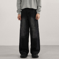 Custom wide leg jeans with black washed denim, curved panel seams, relaxed fit and private label OEM options.