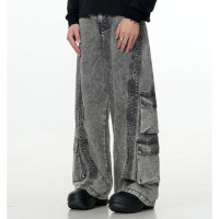 Custom cargo jeans with gray acid wash, wide-leg fit, cargo pockets, contrast trim panels and private label options.